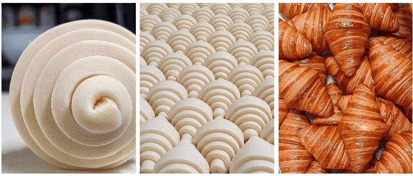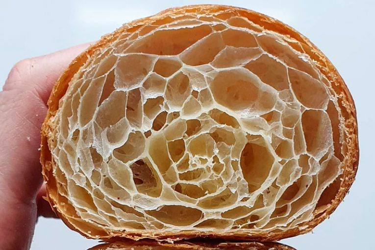 Reproducimos algunos de los tips que Antonio García de Panem realizo a la revista Panorama Panadero al ganar del mejor Croissant artesano de mantequilla en 2021 “nuestra apuesta es un marcado crujiente con un alveolado regular y aireado. Para ganar altura es muy importante el corte del triángulo que, en nuestro caso, lleva doce capas con un pliegue simple y doble. Como punto diferenciador realizamos una fermentación larga, llevamos a cabo el amasado en donde dejamos en frío durante toda la noche las láminas y ya por la mañana introducimos la mantequilla”.